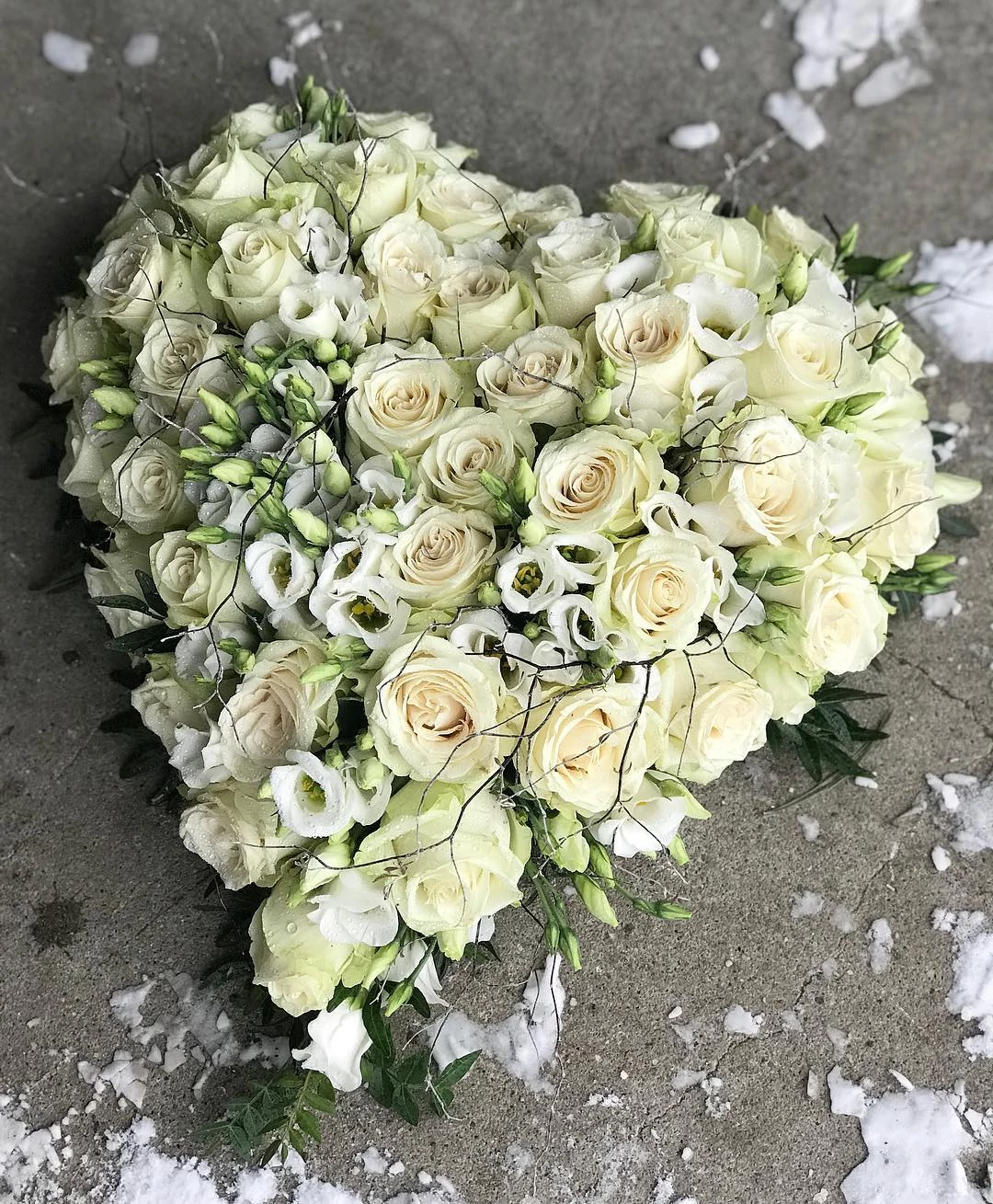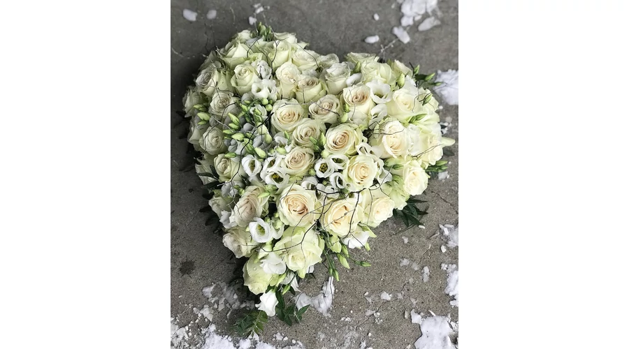 BIO Szív alakú virágkompozíció fehér/krém színű rózsák fehér lisianthus virágok, zöld borostyán levelek díszítésként mérete kb 40 cm. A kompozíció szív alakú, ami a szeretet és a gyász szimbóluma. Friss/szépség garancia mellett rendelheted meg tőlünk Budapesti szállítással! A feltüntetett ár a sírszalag árát tartalmazza! Kérjük rendeléskor a ráírandó szöveget küldd el nekünk! A búcsúztató előtt 1 órával a ravatalozóhoz szállítjuk a megrendelt kegyeleti díszt, ezért az időpont megadásánál kérjük, ezt vedd figyelembe!